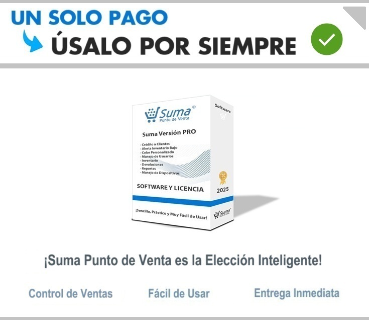 Llevate Suma Punto de Venta PRO a UN SOLO PAGO Y ÚSALO POR SIEMPRE.